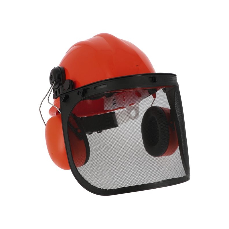Protection de la tête forestier composée de : - casque Calotte en ABS, 4 points de fixation, coiffe textile, tour de tête en plastique équipé d'un serre-nuque à crémaillère permettant un réglage facile, mousse de confort à l'arrière, bandeau antitranspiration. Coloris : orange Norme : CE Cat II - EN 397 - coquilles antibruit adaptables par encliquetage (SNR 25,9 dB). Coloris : orange Norme : CE Cat III - EN 352-3 - porte-visière et visière grillagée. Norme : CE Cat II - EN 1731 Poids : 779 g