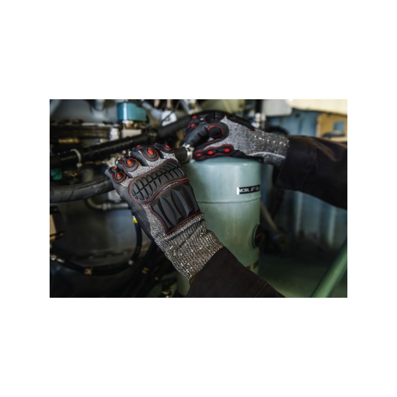 Enduction nitrile sur paume et bouts de doigts. Renforts antichoc en PVC, cousus sur les doigts et le dos. Renfort entre le pouce et l'index. Support tricoté en polyamide, polyéthylène haute densité, élasthanne, fibres de verre et d'acier inoxydables, sans couture, jauge 13. Poignet tricot élastique. Risque heurts Risque coupure F Manutention lourde / Milieu humide Applications métiers : travaux publics, industrie lourde, gros uvre, agriculture, maintenance Taille : 8 à 11 Norme : CE Cat II - EN 388 (4X43FP)