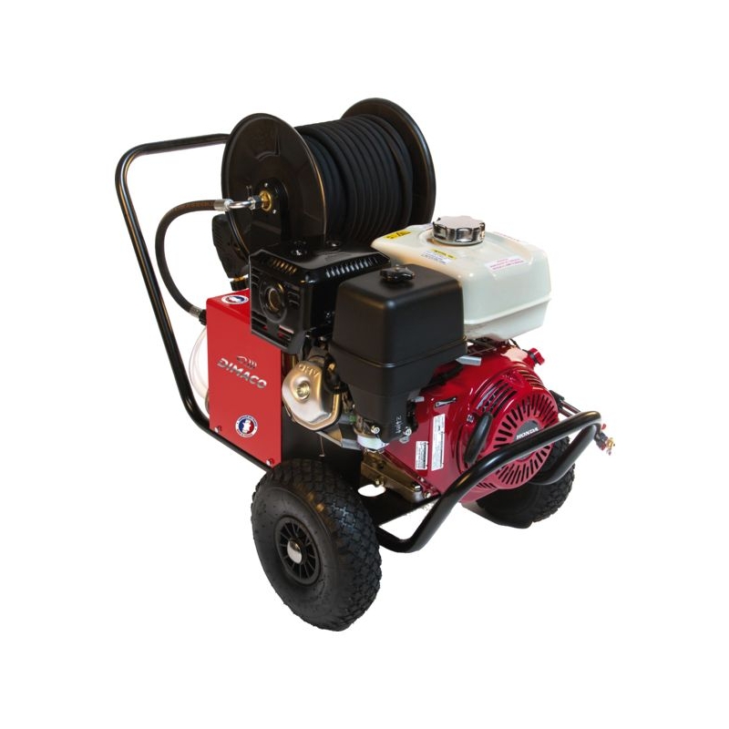 Moteur Honda OHV essence. Puissance 13 CV. Sécurité manque d'huile. Valve de sécurité thermique. Pompe radiale (à vilebrequin), 3 pistons céramique. Pression de service : 240 bar Débit : 900 l/h Poids : 67 kg Accessoires: 1 lance double réglage haute et basse pression, 1 lance turbo, 1 pistolet avec raccord tournant, 1 flexible 3/8'' deux tresses métalliques de 20 m.