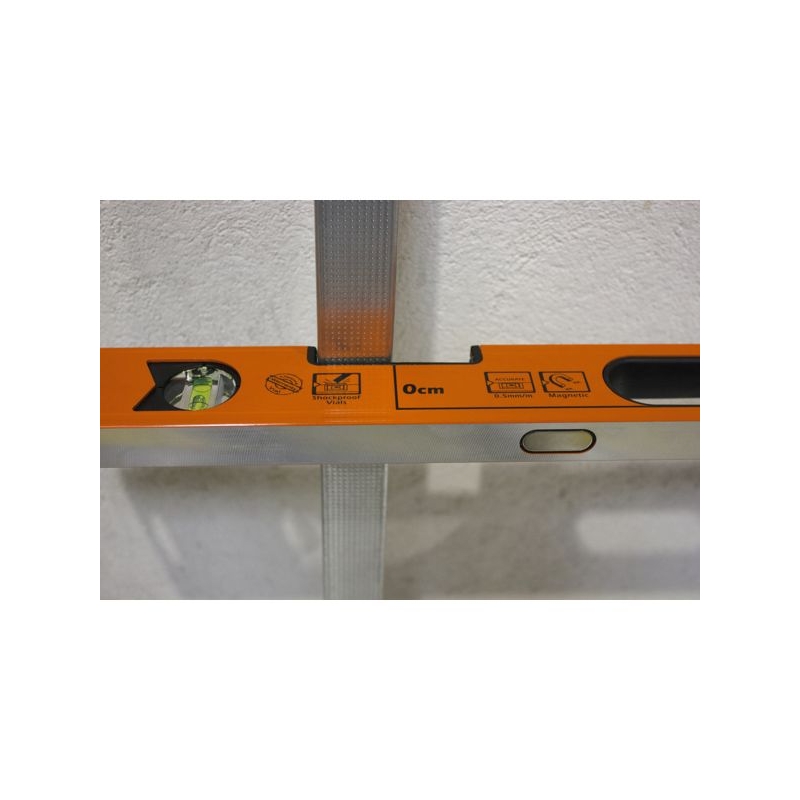 En aluminium. Fioles antichocs. Gabarit pour pose rapide et facile de montants : espacement à 40, 60 et 90 cm. S'adapte à tous montants, même dos à dos, y compris les montants F530. Muni d'une poignée pour faciliter la manipulation. Précision : 0,5 mm/m
