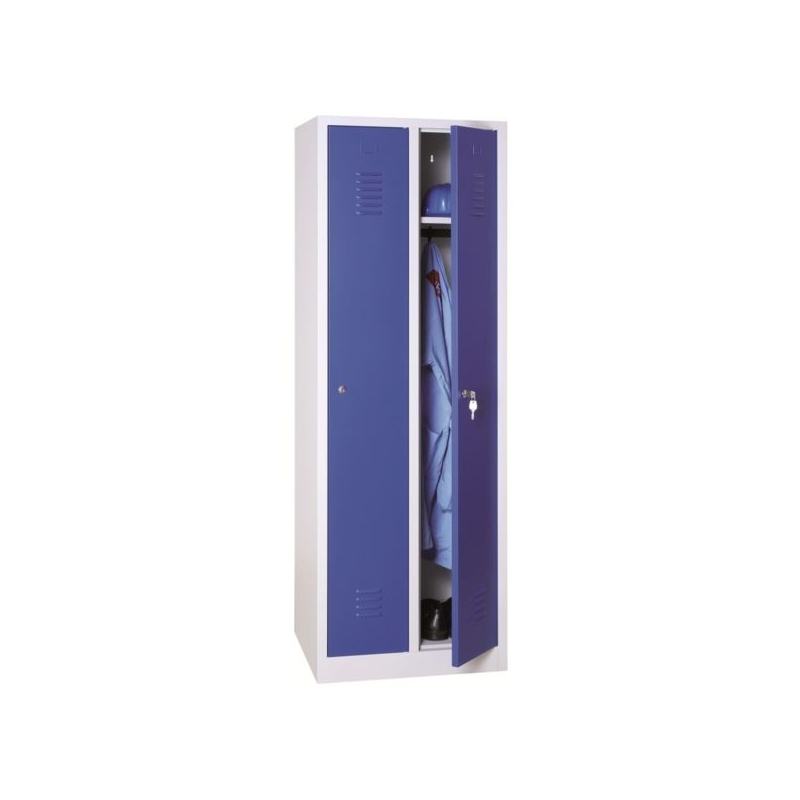 Ouverture des portes à 115°. Fermeture par loqueteau cadenassable. Aération haute et basse. Porte-étiquette. Compartiment chapeau/casque. 1 tringle et 3 crochets pour les modèles industrie propre , 2 tringles + 5 crochets pour les modèles industrie salissante . Perçages pour fixation au mur. Épaisseur de tôle corps et portes : 0,6 mm Hauteur : 1800 mm Profondeur : 500 mm Sans pied.